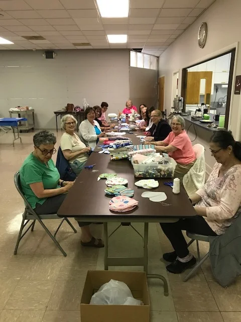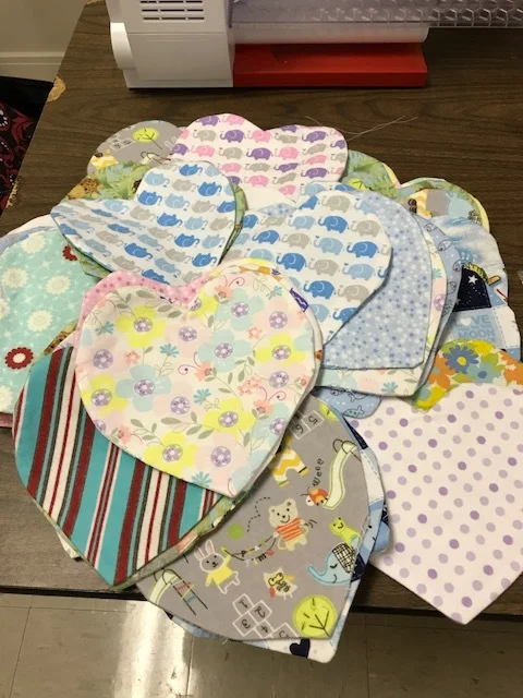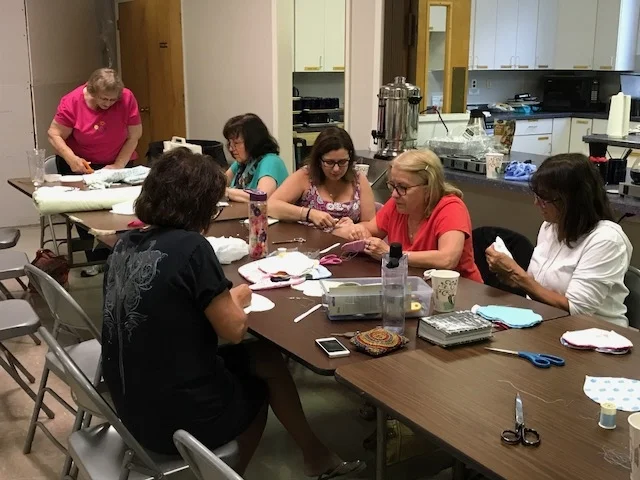 WE WOULD LOVE TO HAVE YOU JOIN US. Some of us crafters bring our machines to do the sewing. The rest of us trace, pin, cut, turn them inside out, hand-stitch, and iron the hearts. Easy, quick, fun. All supplies are provided. It's an evening of great satisfaction as we talk, laugh, and craft to extend God's love to these mothers and babies.